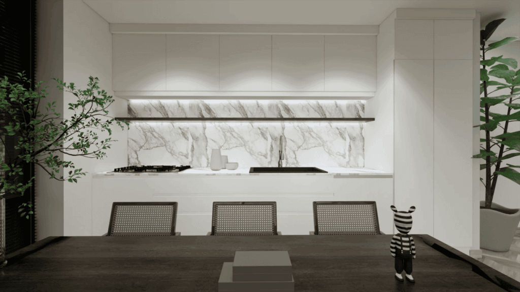 – Open keuken met marmeren werkblad en ingebouwde apparatuur