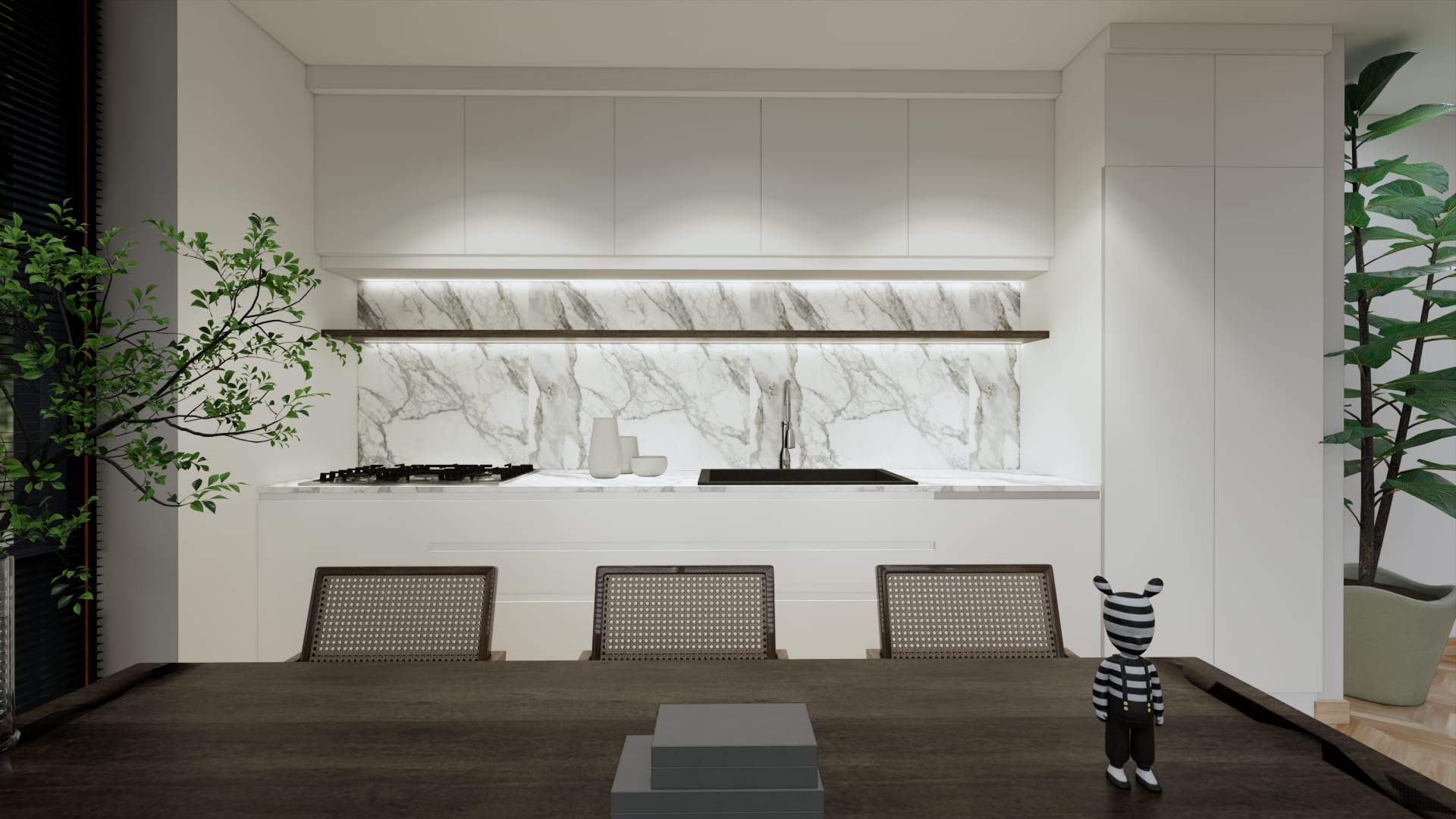 Moderne keuken: open keuken voorzien van een marmeren aanrechtblad, inductiekookplaat, ingebouwde vaatwasser en een combi-oven/magnetron.